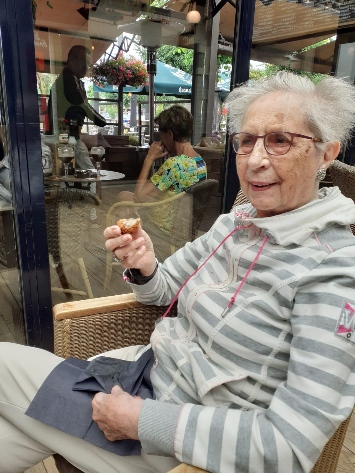 Vanmiddag met haar naar een terras aan de Markt geweest. Ik duw haar voort in een rolstoel. Eerst wilde ze er niet in, maar inmiddels vindt ze het best lekker.