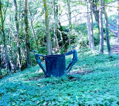Ze wil ons eerst de tuin laten zien, helemaal tot aan beneden waar een stroompje borrelt. Wandelend door de deels wilde tuin komen we diverse kunstobjecten tegen. Een glanzend metalen miereneter waar je het liefst even op zou willen gaan zitten. En de levensgrote kuip van Roberto Barni waar twee mannen aan hangen.