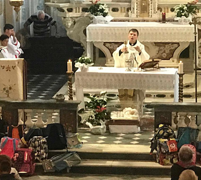 Op verzoek van Don Marco hadden de kinderen hun schoolrugzak mee naar de kerk genomen en zou hij die aan het eind van de mis zegenen. En zo geschiedde. Met een gezegende rugzak keerden de gelovigen na afloop terug naar huis.