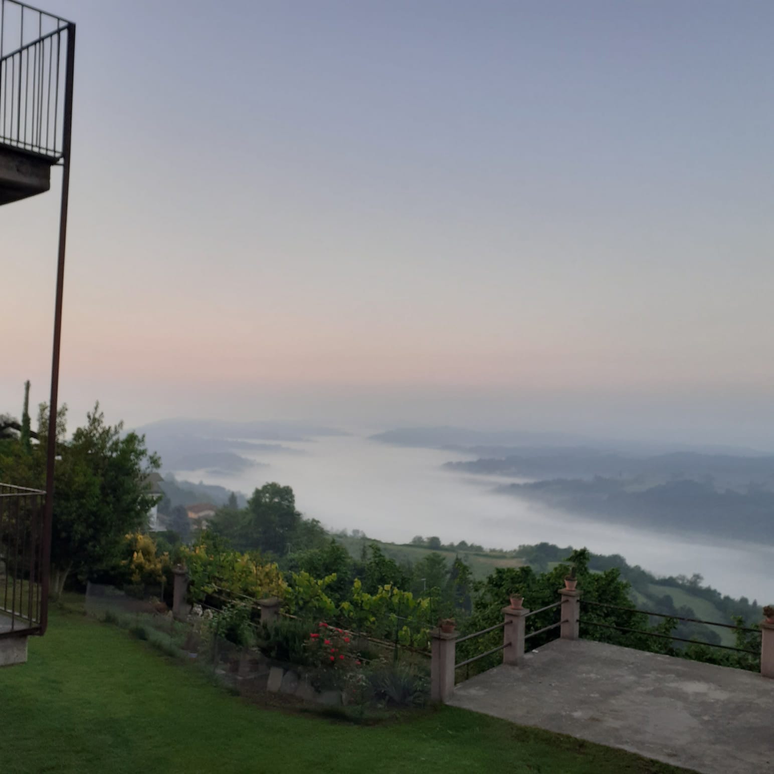 Vanmorgen voor de tweede keer om zes uur gaan lopen. De zon kwam op, de mist lag onder ons dorp en daardoor leek het dal een meer van watten.
