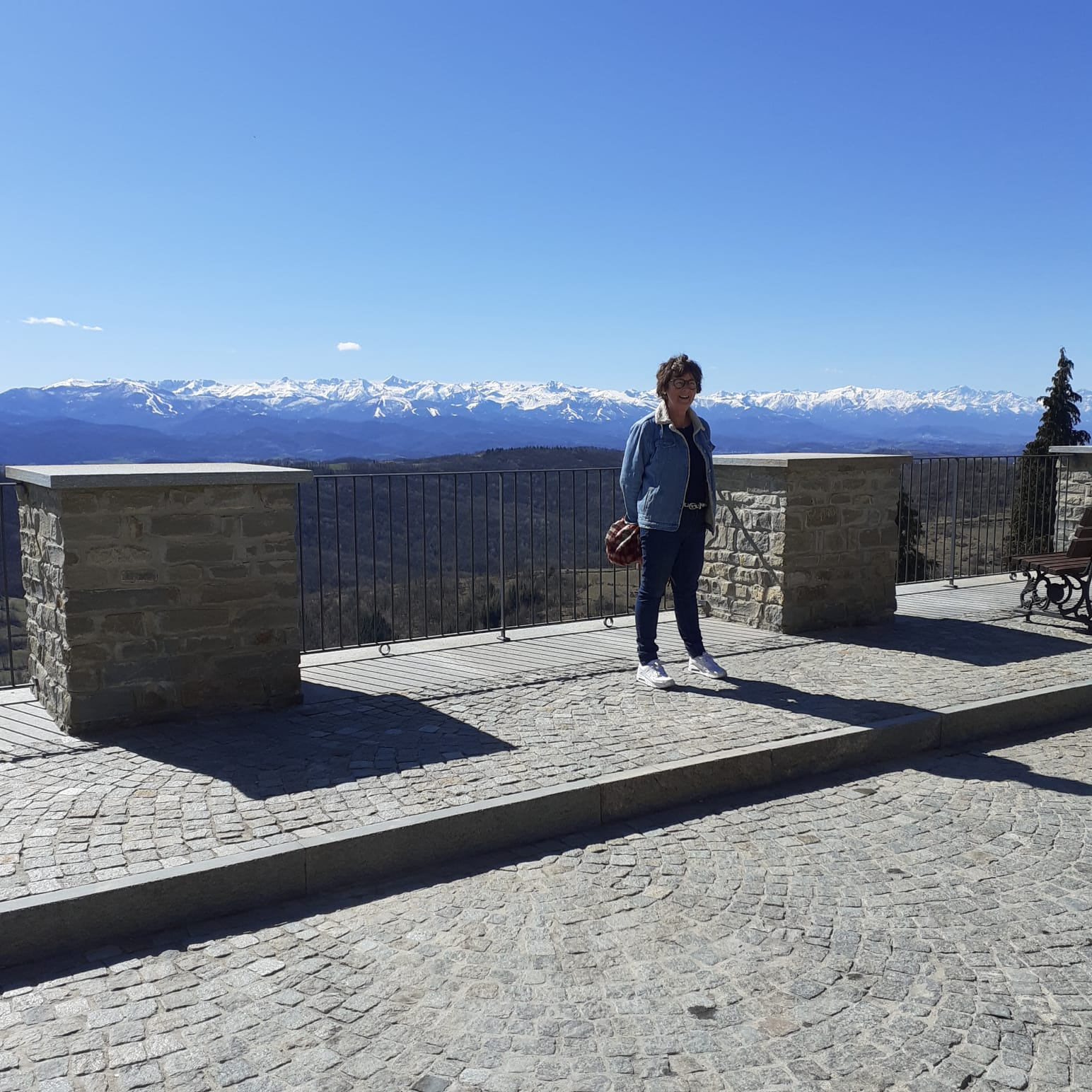"Het is druk boven" zei hij "want je kunt vandaag de zee zien." Rond twaalven wandelde ik ook naar de piazza. Voor de bar zaten arbeiders een broodje te eten. Ornella die achter de bar stond, liep met me mee naar het uitzichtpunt waar we foto's van elkaar maakten en van het kleine streepje zee dat boven de bergrug zichtbaar was.