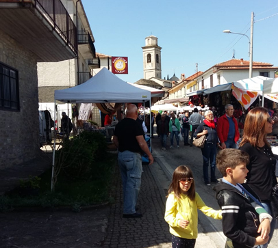 Ik parkeer m'n auto aan het begin van het dorp en wandel het centrum in. Al spoedig loop ik langs marktkraampjes met de gebruikelijke koopwaar. Het is nog niet erg druk. Mensen koesteren zich in de zon en kuieren op hun gemak rond. Ik zie Manuela, mijn buurvrouw, met Guglia en Mattia bij de kinderspelen staan.