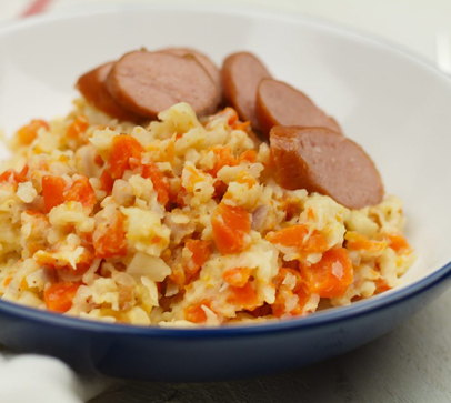 "We koken de aardappelen en de groente eerst, dan gooien we ze bijelkaar, doen er wat boter en melk bij en dan stampen maar met een speciale stamper. Daarna op smaak brengen met peper en zout. En er hoort een worst bij."