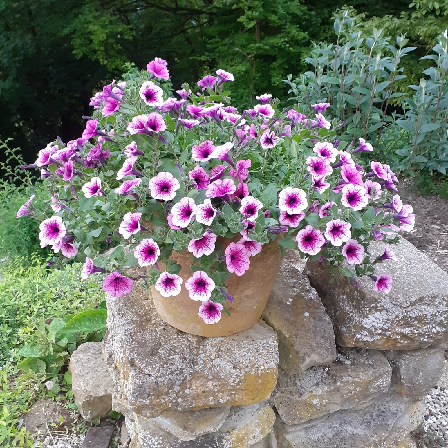 Heb je al eens een grote petunia uit zijn plastic pot van het tuincentrum gehaald om hem over te zetten in een terracotta pot? Moet je 'ns proberen. Bij het uit de pot schudden van de plant ontschoot ie me deze keer en rolde hij naar beneden de hele tuin door. Wonder boven wonder was ie nauwelijks beschadigd.
