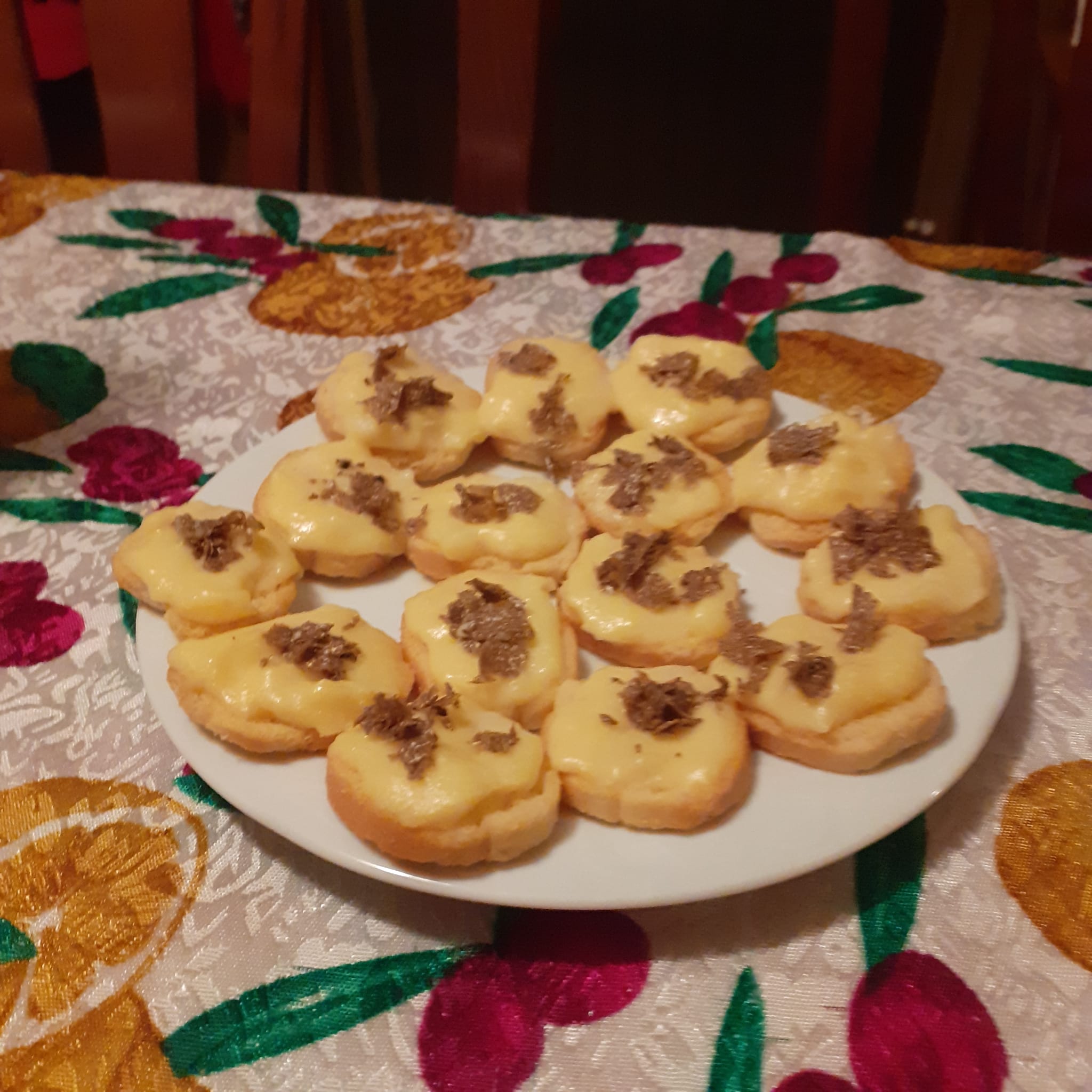 Laat dat maar aan Grazia over. Die heeft meteen alle recepten met truffel paraat.Toen ik tegen etenstijd de woonkamer binnenstapte, stond de hele tafel vol met lekkere hapjes. Toastjes met gesmolten kaas en truffel, carpaccio met truffel, pasta 'in bianco' met truffel, etc..