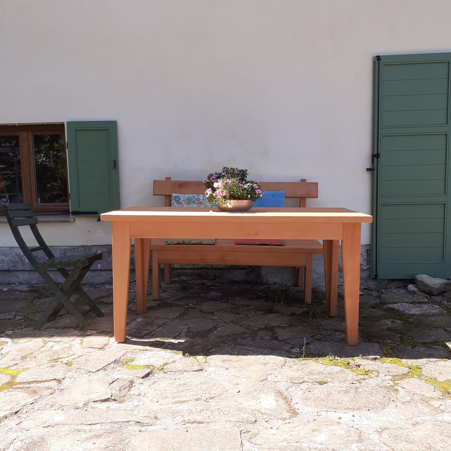 Vol enthousiasme ging Guglio aan de slag en op een dag toonde hij me trots het resultaat. Een stoere tafel van blank hout met mooi vormgegeven stevige poten. Omdat het wel een beetje zijn kindje was, bleef hij zich met de tafel bemoeien. Voordat ie aan regen en zon blootgesteld zou worden, moest ik hem beslist eerst beitsen. Nou dat was geen probleem. Even de kwast erover en klaar.