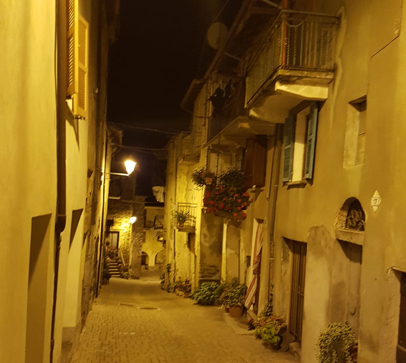 Afgelopen zomer werden er in Monesiglio concerten georganiseerd in de tuin van het kasteel met vooraf eten. Het waren drukbezochte avonden. Na afloop liepen we naar beneden naar de piazza. Bij het passeren van wat smalle straatjes en binnenpleintjes zag ik pas hoe schilderachtig Monesiglio kan zijn. De huizen baadden in het zachtgele licht van de straatlantaarns en ook hingen er overal bloemen.