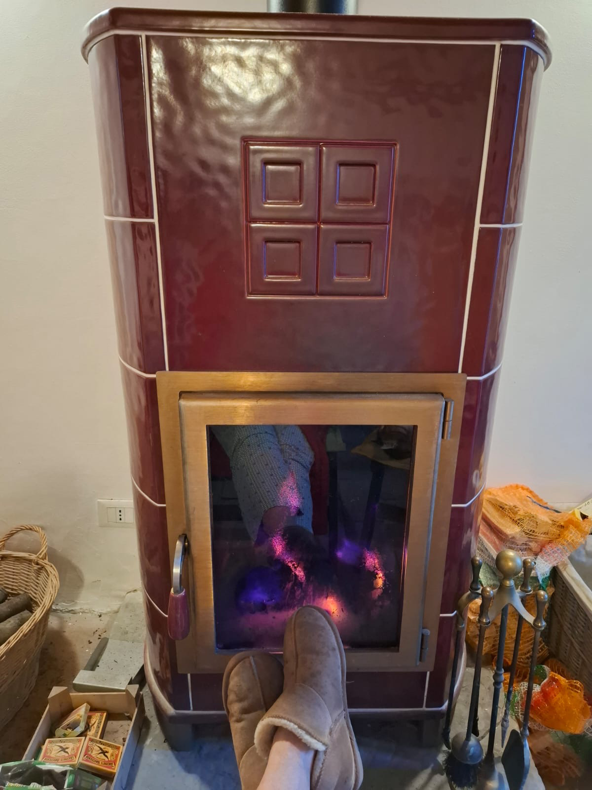 Ik zit heerlijk met m'n pantoffels voor de houtkachel. Het weer is beroerd, dus ik hoef even niks. Niet te lopen, nergens naartoe. Hier was ik wel aan toe na vier weken rondreizen door Nederland.