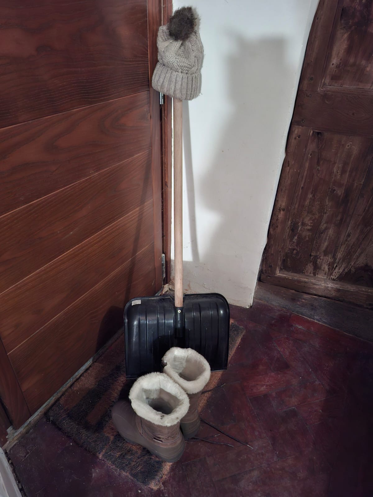 Het gedoe met de kachels is dus een dagelijks karwei en dan mag ik blij zijn als het daarbij blijft. Maar o wee, de afgelopen week viel er ook nog 'ns een halve meter sneeuw. Dat betekent dat ik, na het werk aan de kachels, m'n laarzen aantrek en met de sneeuwschep naar buiten ga om de auto uit te graven.