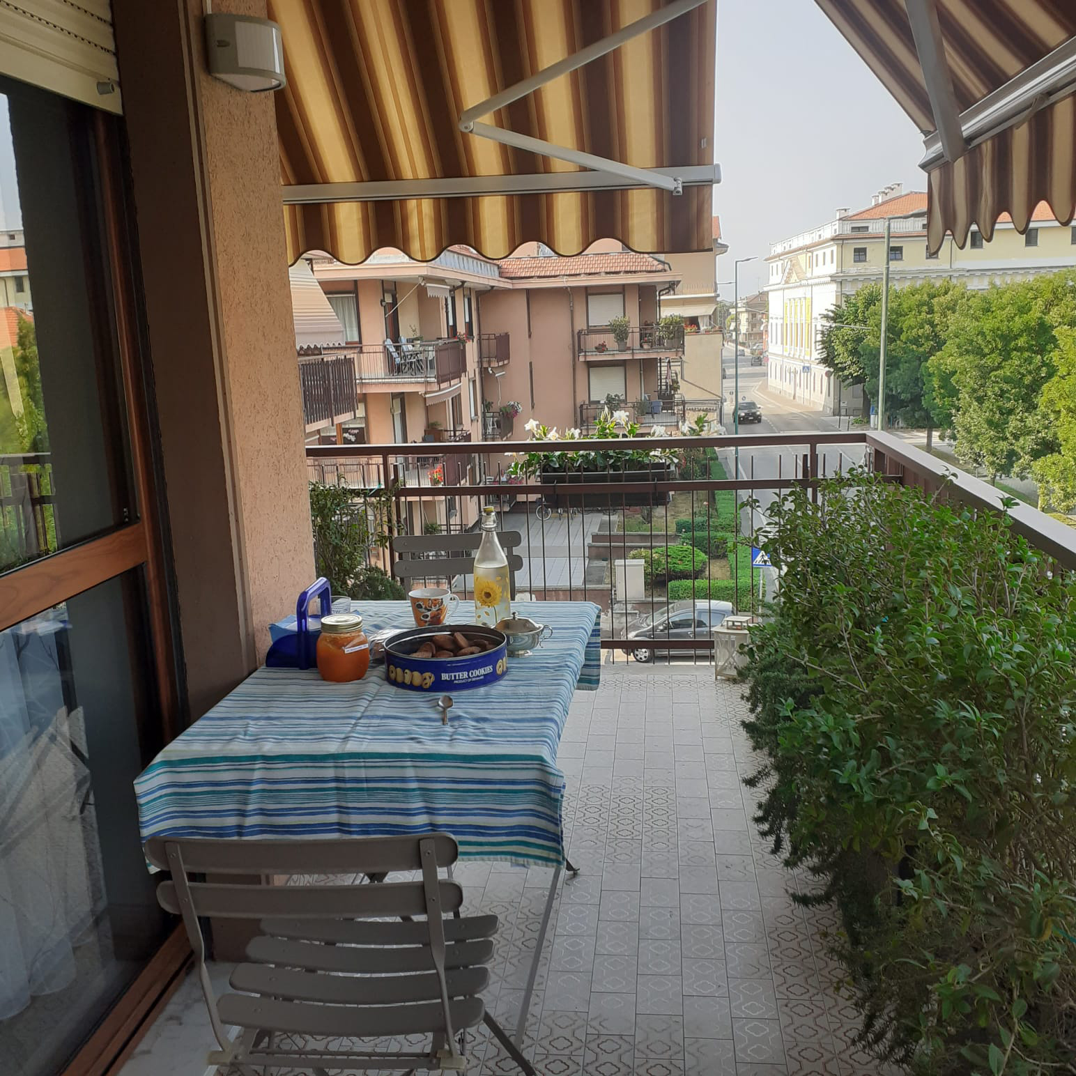 Speciaal voor mij had Egle op het balkon een tafel gedekt voor het ontbijt. Er stond een grote doos met koekjes op de tafel. Verder wat droge biscuitjes, een croissant en heerlijk zelfgemaakte jam. ""Caffé?" vroeg ze. "Graag caffé latte Egle" antwoordde ik.
