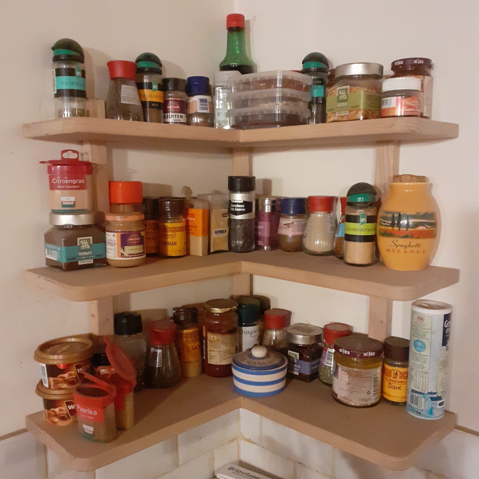 Als ik m'n huis binnenstap, wacht me een verrassing: Guglio heeft een supergroot kruidenrek voor me gemaakt. En ingeruimd. Wat een verschil met de chaos van eerst. En ook heeft hij twee planken boven de aanrecht gemaakt.