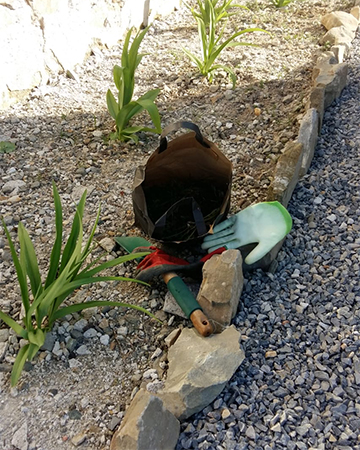 Dan volgt m'n dagelijkse tuinronde. Handschoenen aan, pet op, rubber laarzen aan en heerlijk wroeten in de aarde. Onkruid eruit trekken, soms nieuwe bloemen planten, uitgebloeide bloemen eruit knippen, tomaten opbinden, soms wat snoeien en ook de oogst van de dag uit m'n moestuin halen.